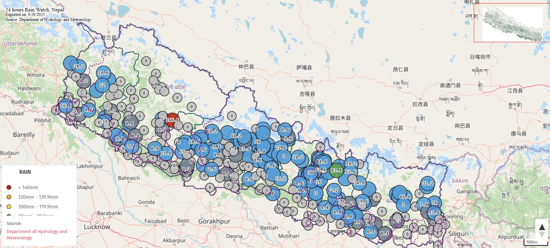 जल तथा मौसम विज्ञान विभाग, मौसम पूर्वानुमान महाशाखाका अनुसार रूकुमपश्चिमको बाफीकोटमा पछिल्लो १२ घन्टामा १४६.४ मिलिमिट वर्षा भएको छ। सिन्धुपाल्चोकको बाह्रबिसेमा ८३.४, कास्कीको लामापाटनमा ६० मिलिमिटर वर्षा भएको छ।