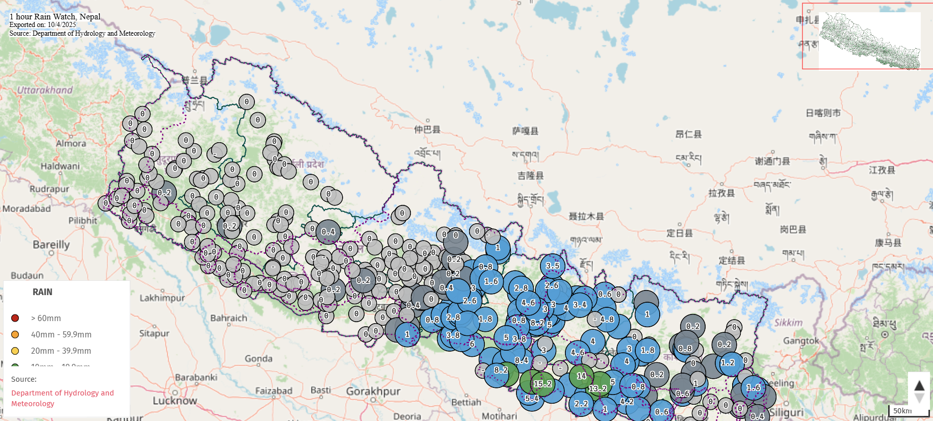 मौसम विभागका अनुसार पछिल्लो एक घन्टामा धनुषाको तुलशीमा १४ मिलिमिटर वर्षा भएको छ। सर्लाहीको मनुस्मारामा १५.२, धनुषाको चिसापानी बजारमा १३.२, कमला नदीमा १३.२, रौतहटको गरूडामा १०.२, बाराको कलैयामा ११.२ मिलिमिटर वर्षा भएको छ।