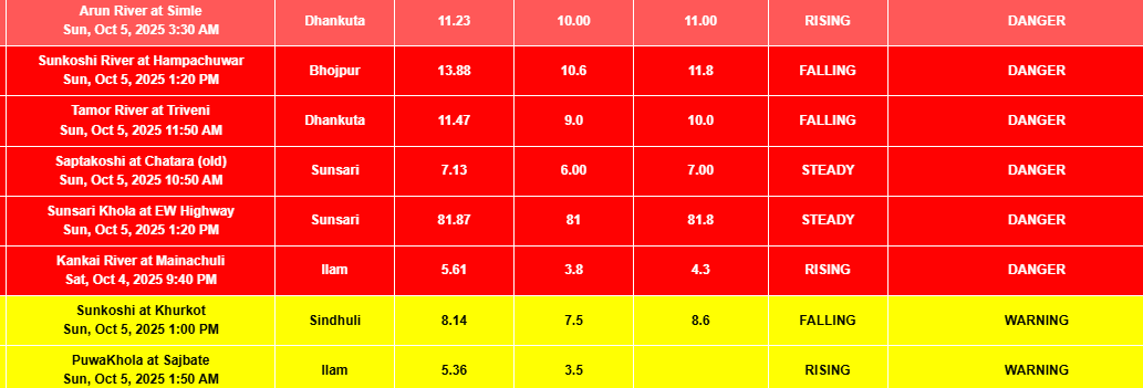 जल तथा मौसम विज्ञान विभाग, बाढी पूर्वानुमान महाशाखाले अरूण, तमोर, सप्तकोशी, केशलिया र कन्काई नदीका केही स्थानमा बाढीले खतराको तह पार गरेको बताएको छ।