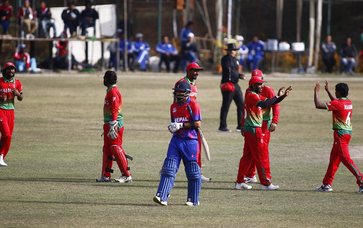पूर्व कप्तान पारस खड्काले ११ रन मात्रै बनाउन सफल भएका छन् भने कप्तान ज्ञानेन्द्र मल्ल १९ रनमै आउट भएका थिए। अहिले माल्दिभ्सले ब्याटिङ गरिरहेको छ।
