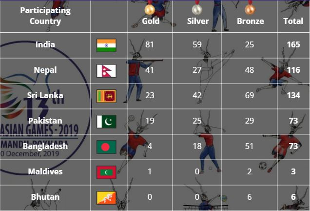 ४ स्वर्ण जितेको बंगलादेस पाँचौ स्थानमा छ भने १ स्वर्णसहित माल्दिभ्स छैठौं स्थानमा छ। एक स्वर्ण पनि नबटुलेको भुटान अंकतालिकाको पुछारमा छ। भुटानले ६ कास्य जितेको छ।