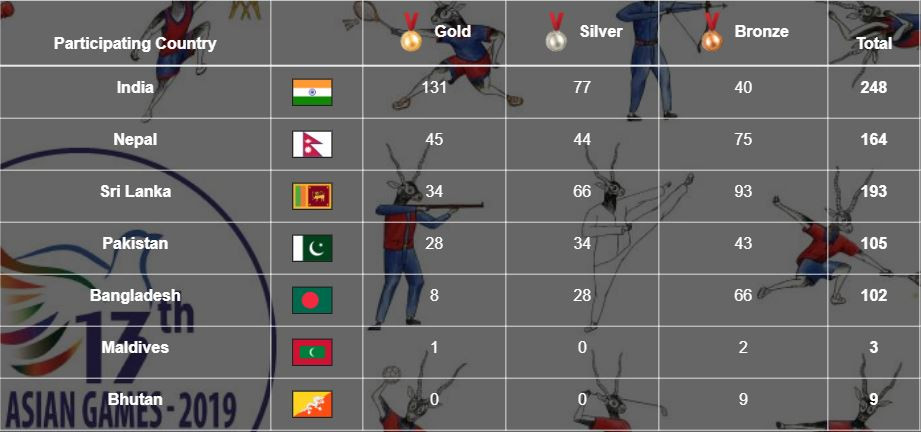 २४ स्वर्णसहित श्रीलंका तेस्रो स्थानमा छ। २८ स्वर्ण जोडेको पाकिस्तान चौथो र ८ स्वर्ण जोडेको बंगलादेश पाँचौ स्थानमा छन्।