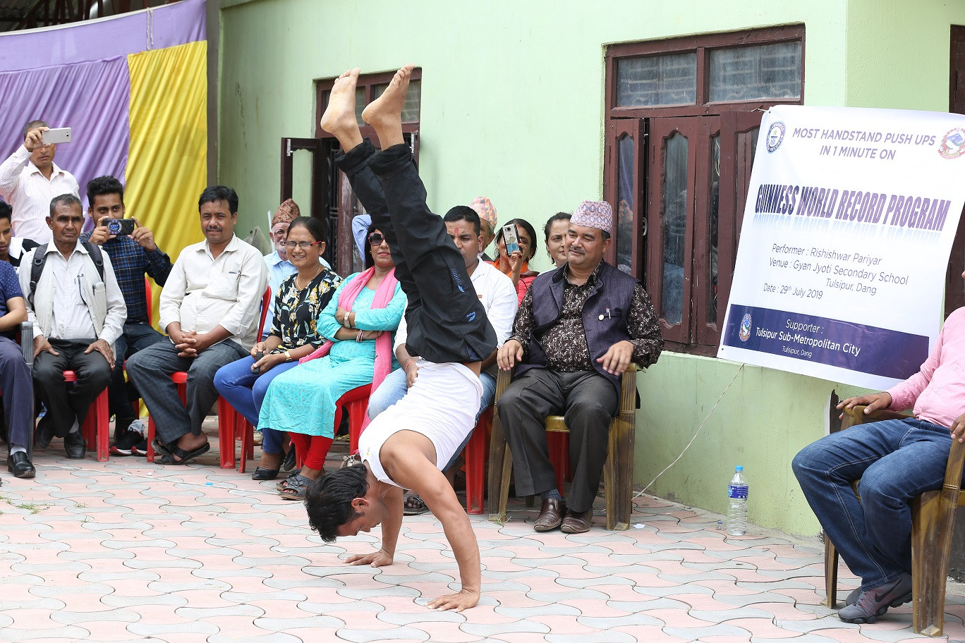दाङको तुलसीपुरका ऋषि परियारले गिनिज बुक अफ वर्ल्ड रेकर्डमा नाम लेखाउन एउटा सार्वजनिक कार्यक्रम गर्दै एक मिनेटमा ६० पटक ‘पुसअप’ गरेका छन्। तुलसीपुर–३ का परियारले सोमबार तुलसीपुरमा ‘ह्याण्ड स्ट्याण्ड पुस अप’ मिनेटमा ६० पटक गरेका हुन्।