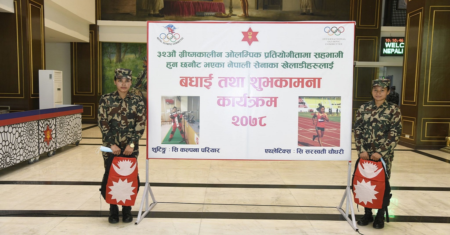 सेनाको जनसम्पर्क तथा सूचना निर्देशनालयका अनुसार ओलम्पिक प्रतियोगितामा नेपाली सेनाको त्रिभुवन आर्मी क्लबकी सिपाही सरस्वती चौधरीले एक सय मिटर स्प्रिन्ट विधामा र क्लबकी सिपाही कल्पना परियारले १० मिटर एयर राइफल विधामा प्रतिस्पर्धा गर्ने छन् ।