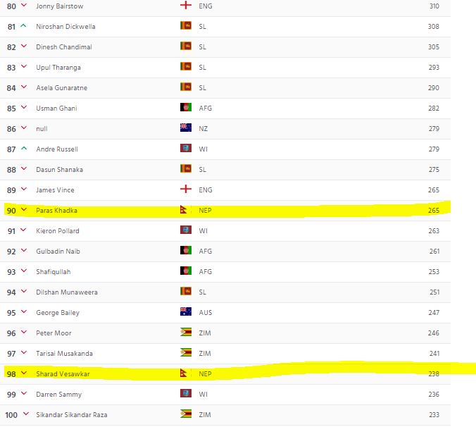 ब्याटिङतर्फ कप्तान पारस खड्का र शरद भेषावाकर तथा बलिङतर्फ बसन्त रेग्मी र सोमपाल कामी शीर्ष १०० भित्र अटाएका हुन् । १२ अन्तर्राष्ट्रिय खेलमा २३६ रन बनाएका थिए भने भेषावकरले ११ खेलबाट १९९ रन बनाएका थिए।