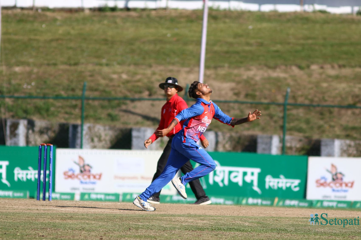 डेब्यूसहित अघिल्ला ३ खेलमा लगातार अर्धशतक बनाएका कुशल भुर्तेल १६ रनमा आउट भएपछि कप्तान ज्ञानेन्द्र मल्लले अर्का ओपनर आसिफ शेखसँग दोस्रो विकेटका लागि ७३ रनको साझेदारी गरेका थिए ।