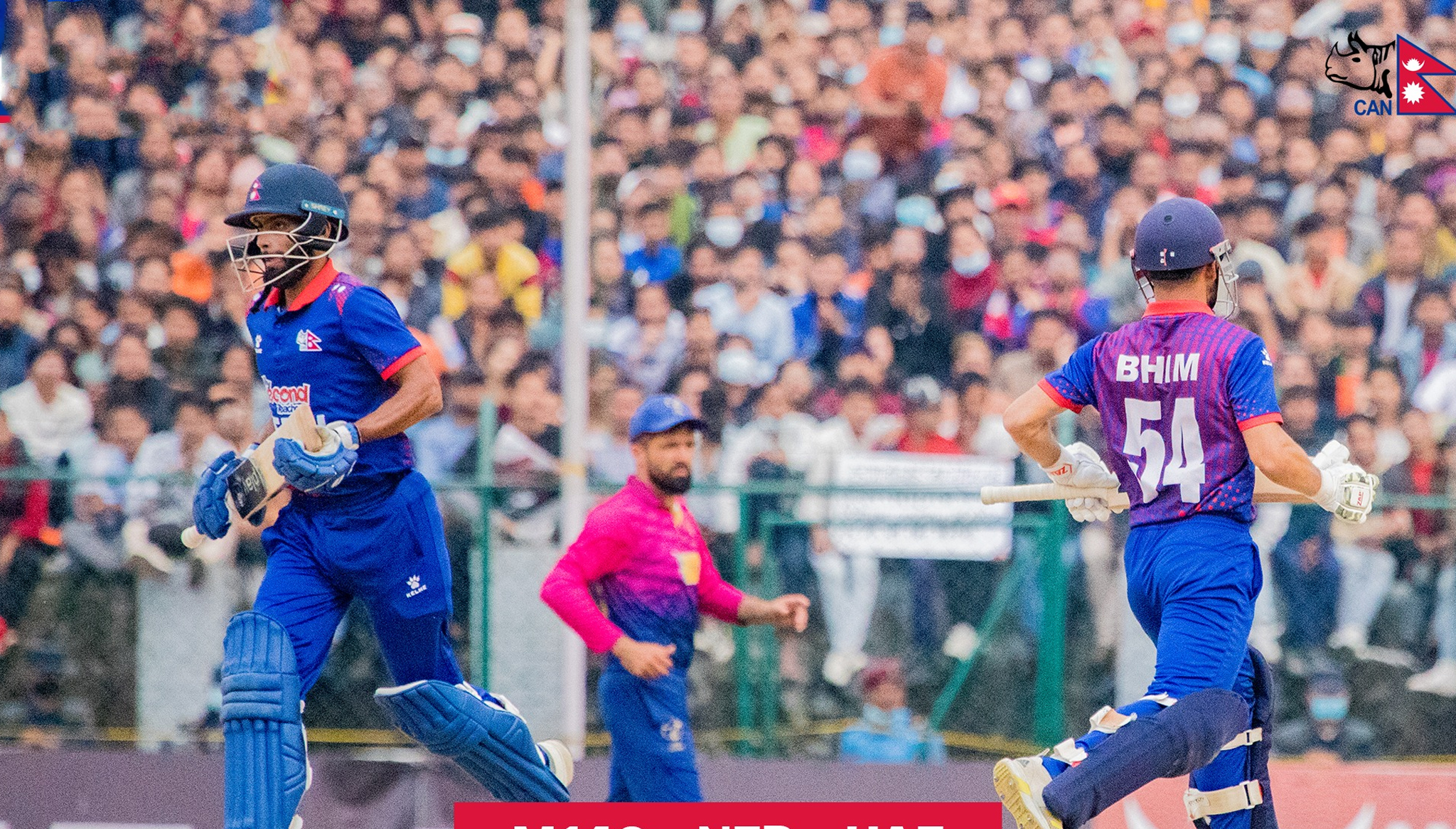 नेपालका लागि भीम सार्की र कुशल भुर्तेलले अर्धसतक पूरा गरेका छन्। भुर्तेल ५० रन बनाएर आउट हुँदा सार्कीले ६७ रन बनाए।