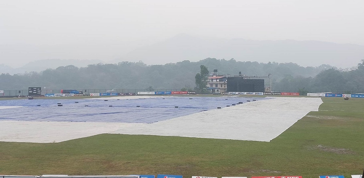 मुलपानी मैदान विहान ९ बजे सुरु हुने पर्ने खेल वर्षा कारण मध्यान्ह १२:३० बजेसम्न पनि टस हुन सकेन।