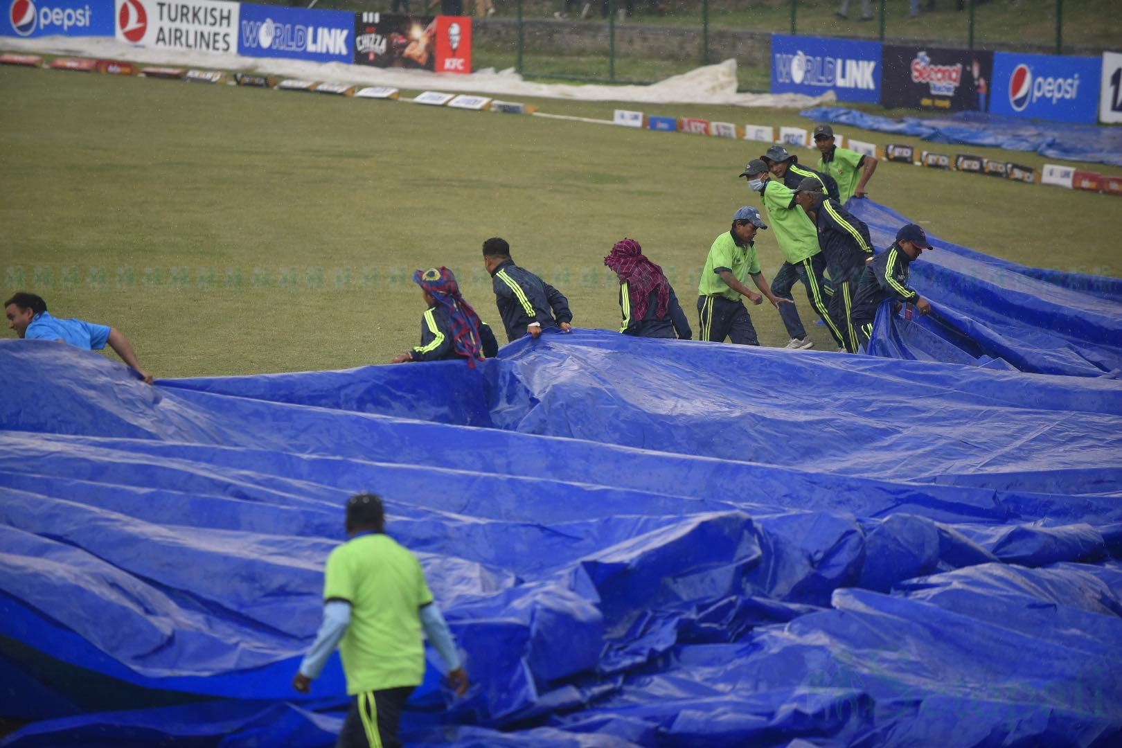कीर्तिपुरस्थित त्रिवि मैदानमा टस हारेर पहिले ब्याटिङ गरेको नेपालले २३.२ ओभरमा ३ विकेटको क्षतिमा १४१ रन बनाउँदा रोकिएको हो।