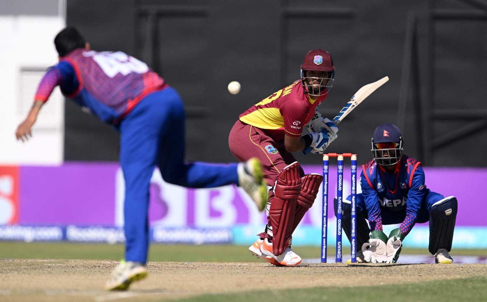 नेपालका ओपनर कुशल भुर्तेल वेस्ट इन्डिजका अल्जारी जोसेफबाट ५ रनमा बोल्ड भए भने भीम सार्की जासन होल्डरको बलमा २ रनमा क्याच भए। आसिफ शेख २८ रनमा आउट भए। उनले ३६ बलमा ३ चौका हिर्काए।