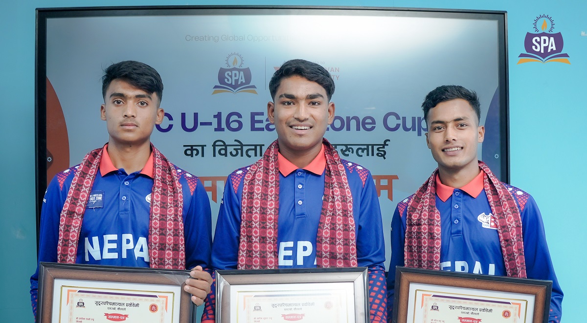 अघिल्लो हप्ता मलेसियामा सम्पन्न एसीसी यू–१६ इस्ट जोन कपको उपाधि जितेको नेपाली टोलीका तीन जना खेलाडीहरुलाई एसपीए कलेजले सम्मान गरेको छ ।