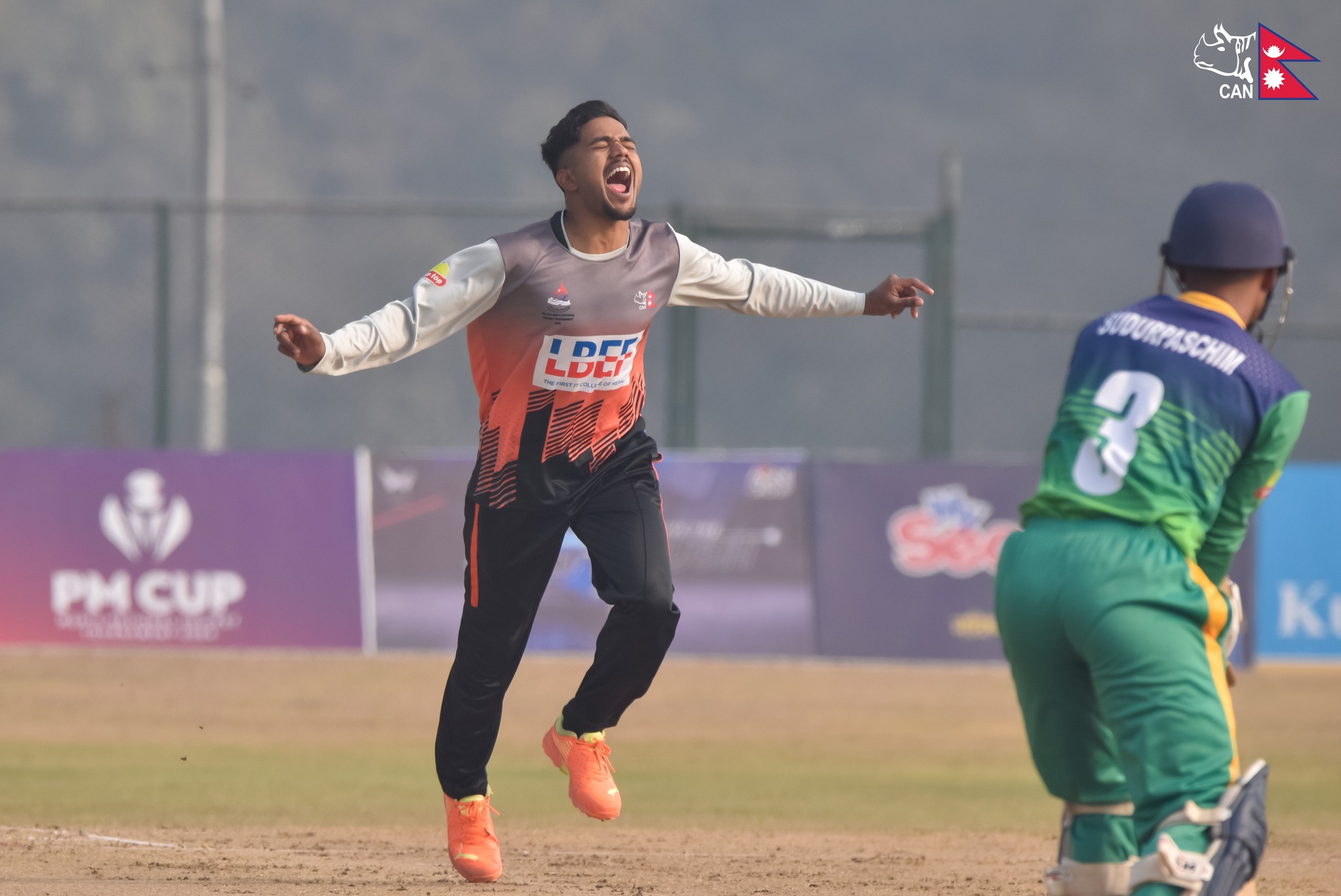 त्यसअघि टस हारेर पहिले ब्याटिङ गरेको सुदूर १६.२ ओभरमा ८७ रनमा अलआउट भयो। उसका लागि नारायण जोशीले नटआउट ३१ रन जोडे। अरु ब्याटर सस्तैमा आउट भए।