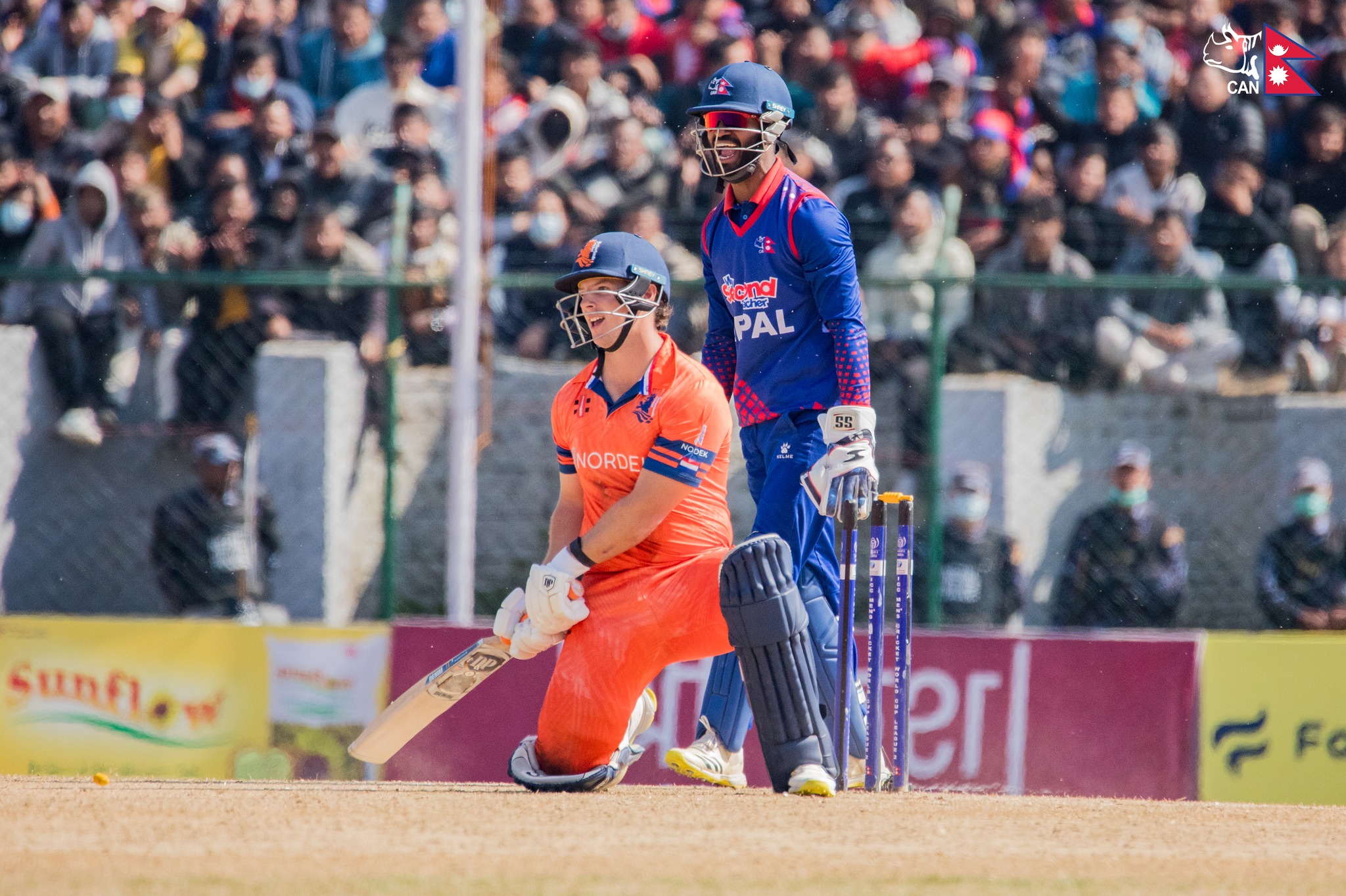 आसिफ आउट भएपछि ब्याटिङमा आएका अनिल साह चल्न सकेनन्। उनी ७ रनमा आउट भए। दुई ओभरपछि कुशल मल्ल २ रनमा आर्यन दत्तको एलबिडब्लूको धरापमा परेपछि नेपालमाथि दबाब परेको थियो। त्यतिबेला नेपालले १३ ओभरमा ३ विकेट गुमाउँदा ५४ रन जोडेको थियो।