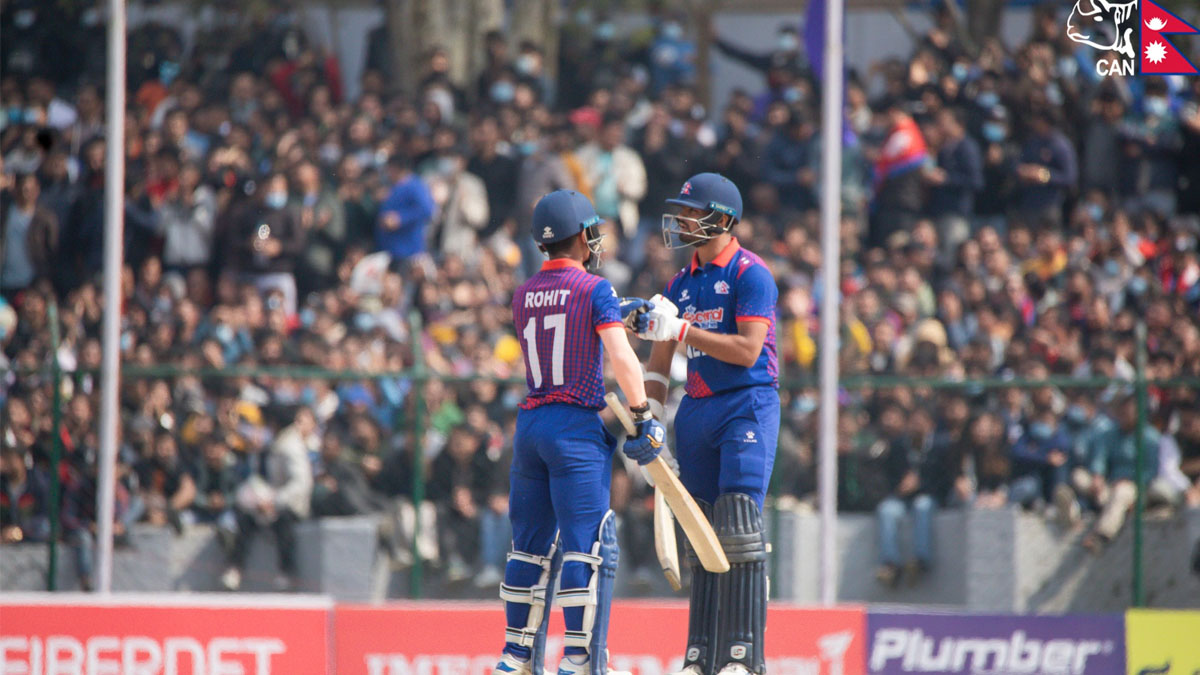 त्यसअघि कप्तान रोहित पौडेलले ४६ रनको योगदान गरे। १४.३ ओभरमा भिभियन किंग्माबाट आउट हुनुअघि उनले ३४ बलमा ३ चौका र एक छक्का प्रहार गरे।