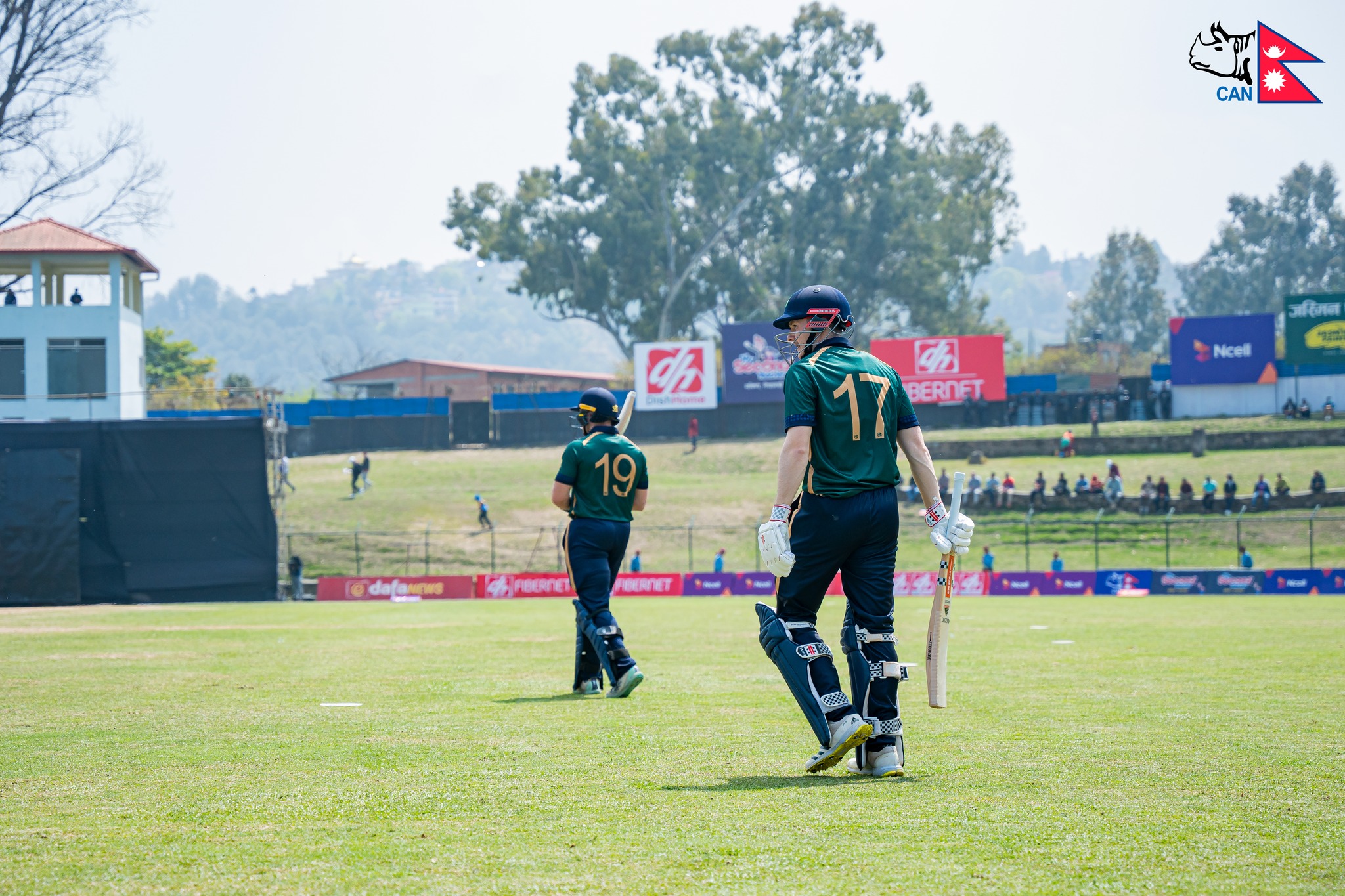 यस्तै ललित राजवंशीले कोड कारमाइकलाई चौथो ओभरमा ८ रनमा एलबिडब्लूको धरापमा पारे। यस्तै सातौं ओभरको दोस्रो बलमा गुल्सन झाले मोर्गन टपिङ शून्यमा बोल्ड गरे।