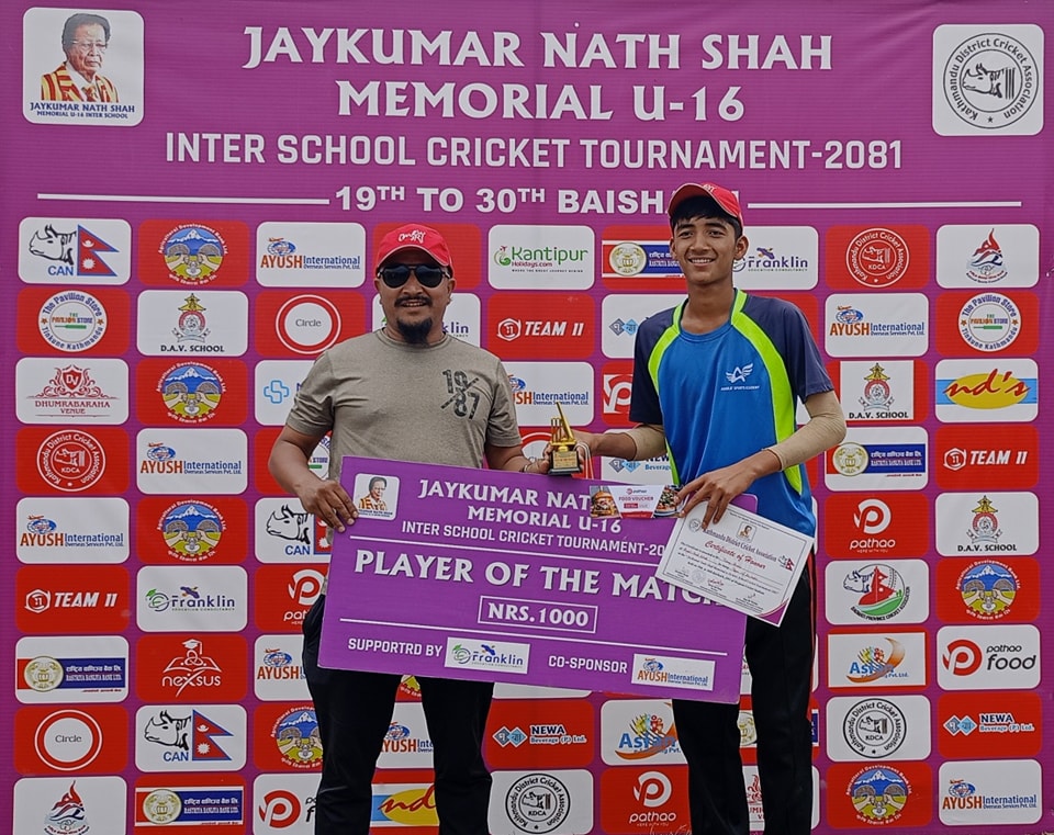 काठमाडौं जिल्ला क्रिकेट संघको आयोजनामा भइरहेको जयकुमार नाथ शाह मेमोरियल यू-१६ इन्टर स्कुल क्रिकेट प्रतियोगितामा एन्जल हर्टले जित हात पारेको छ।