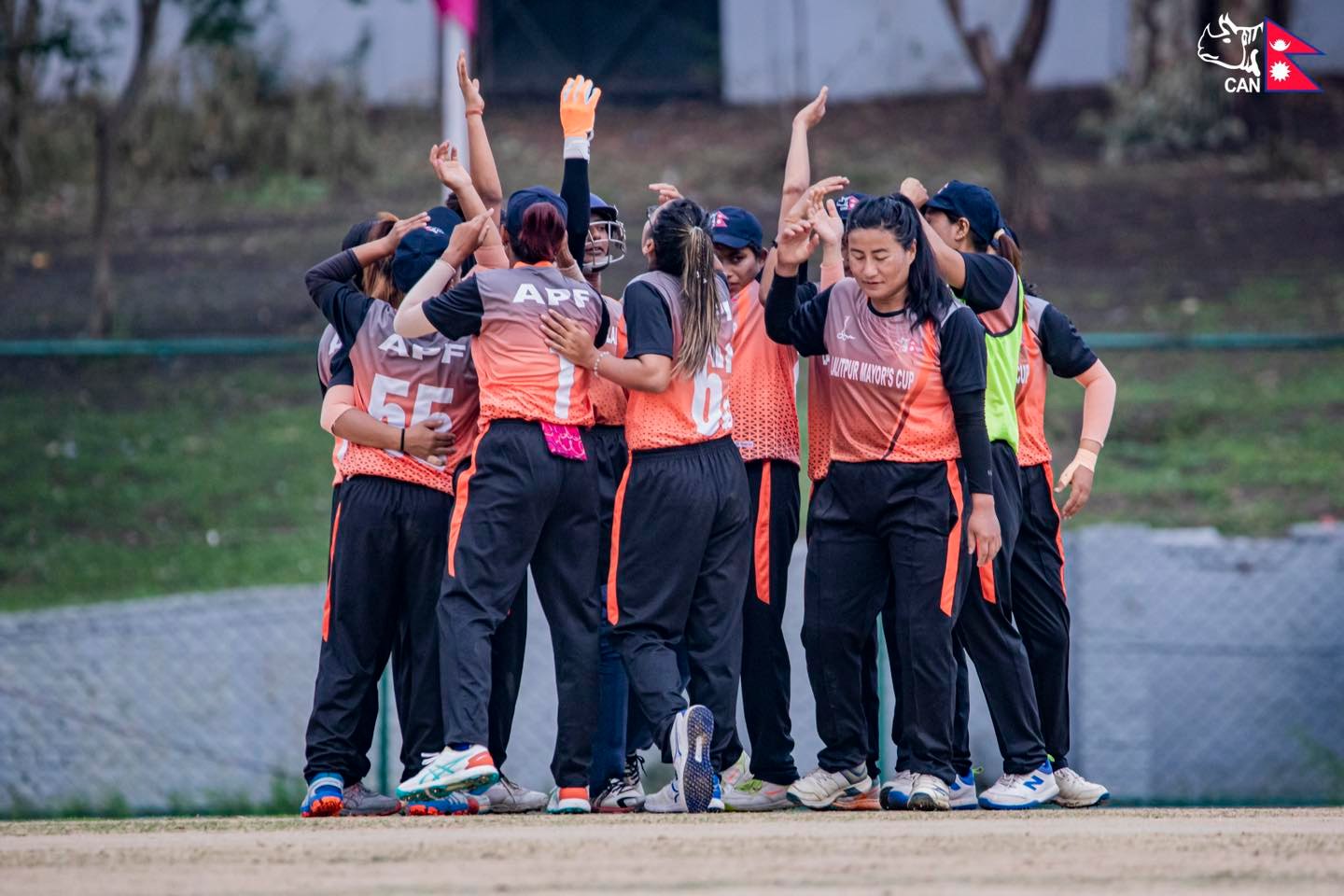 त्यसअघि टस हारेर ब्याटिङको निम्तो पाएको एपिएफले तीन विकेट गुमाउँदै ५६ रनको चुनौतिपूर्ण योगफल तयार पार्यो। इन्दु बर्माले १५ बलमा ३८ रनको योगदान गरिन् ।