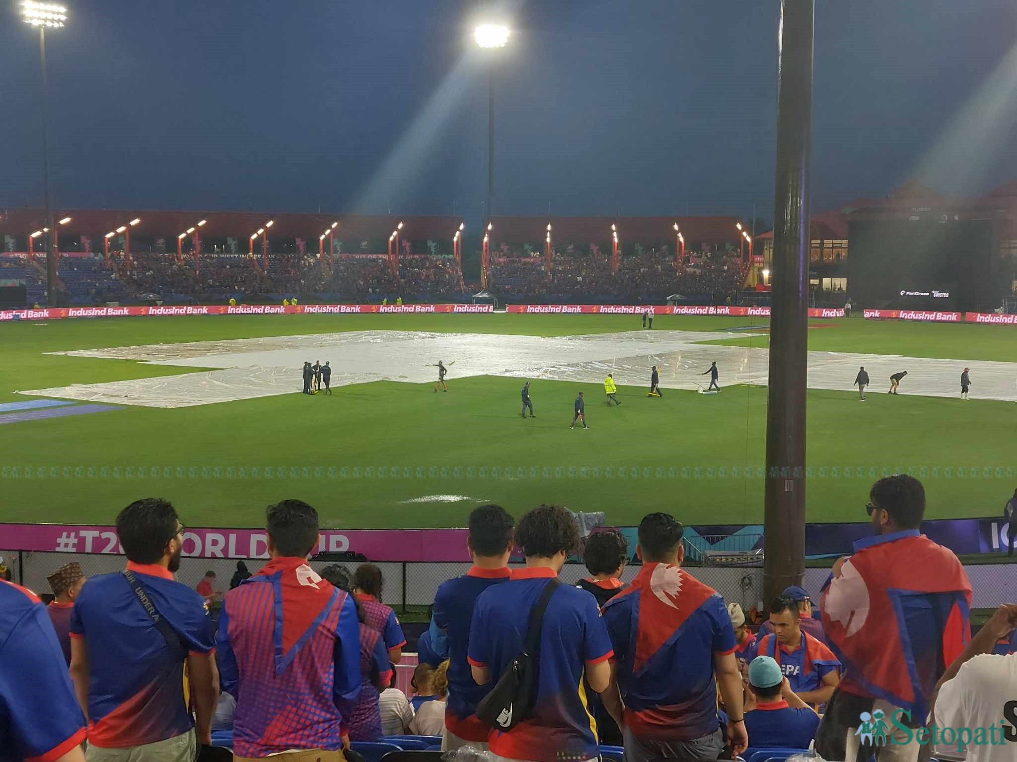 मैदानको आउटफिल्डमा पानी जमेको थियो। मुख्य पीच छोपिए पनि रनिङ क्षेत्र वर्षातका कारण भिजेको थियो।