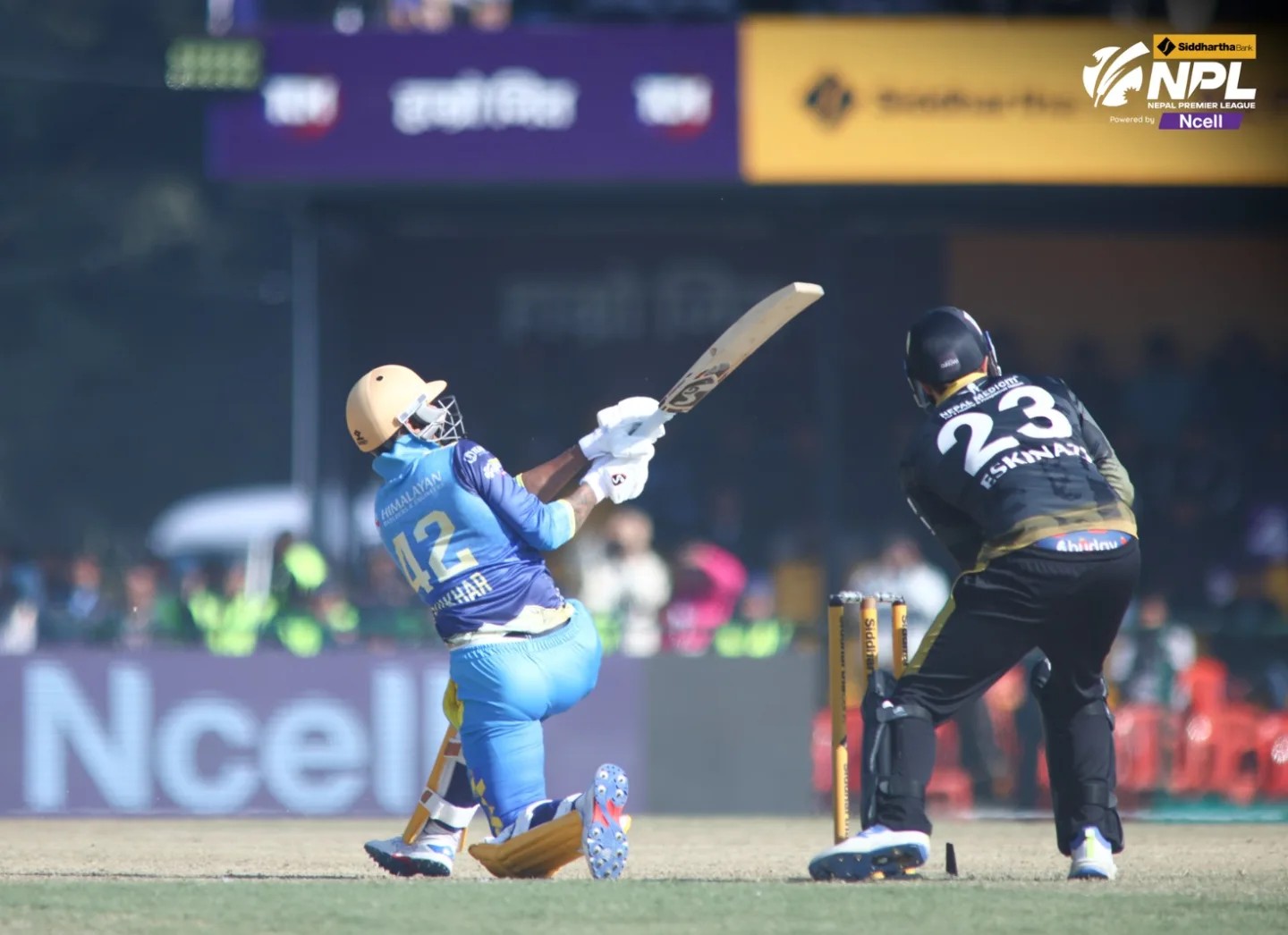 बाबर हायतले १८ बलमा १३ रन मात्र जोड्न सके। १४औं ओभरमा आउट भएका गुल्सन झाले १९ बलमा १ चौका प्रहार गर्दा १२ रन मात्र जोडे। अर्को ओभरमा अर्जुन घर्ती ४ रनमा स्वटरबाट बोल्ड भए।