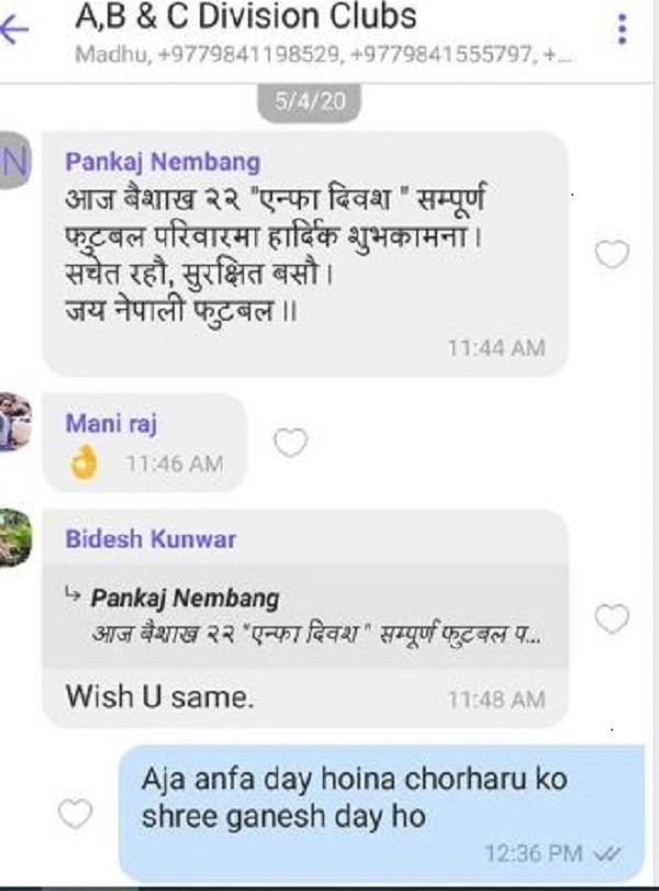 उनले विहान ११:४४ मा 'आज वैशाख २२ एन्फा दिवस सम्पूर्ण फुटबल परिवारमा हार्दिक शुभकामना। सचेत रहौं, सुरक्षित बसौं। जय नेपाली फुटबल' भन्दै शुभकामना दिए। एक घन्टापछि ललितपुर जिल्ला फुटबल संघका अध्यक्ष पुरुषोत्तम थापाले दिएको जवाफ अपेक्षाकृत थिएन।