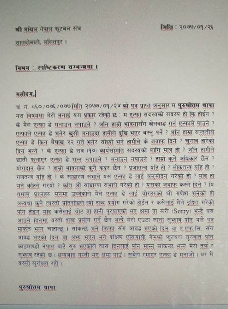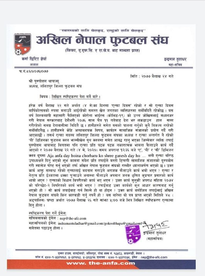 एन्फा दिवसमा आफ्नो असन्तुष्टि पोखेका ललितपुरका अध्यक्ष थापालाई एन्फाले वैशाख २४ गते लिखित स्पष्टिकरण पेश गर्न भन्दै पत्र काटेको थियो। थापाले भाइबरमा गरेको टिप्पणी सामाजिक सञ्जालको दुरुपयोग गरेको भन्दै ध्यानाकर्षण भएको पत्रमा उल्लेख छ। एन्फाले थापालाई कानुनविपरितको कार्य गरेको भन्दै ४८ घन्टाभित्र स्पष्टिकरण पेश गर्न भनेको थियो।