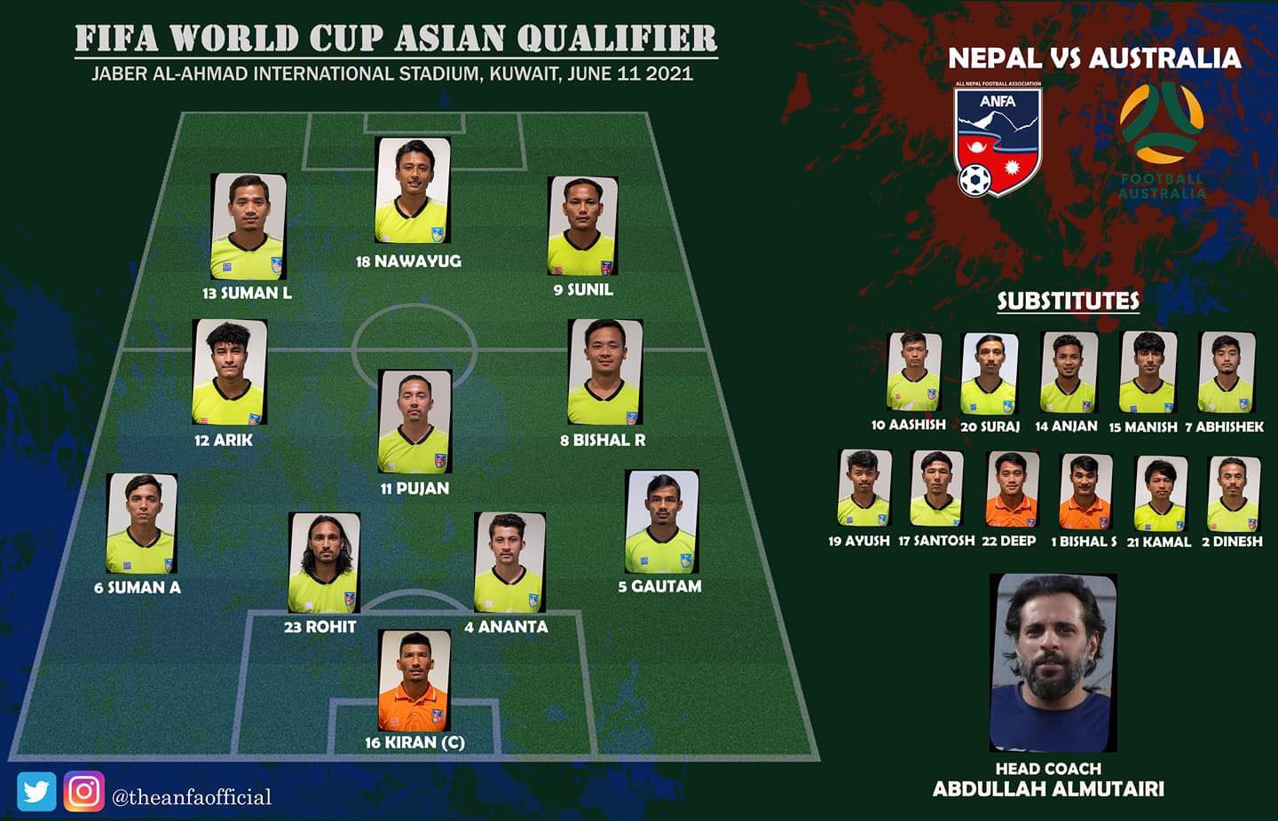 अस्ट्रेलियाविरुद्धको खेलमा नेपाली प्रशिक्षक अब्दुल्लाह अलमुताइरीले टोलीमा पाँच परिवर्तन गर्दै अन्तिम ११ को घोषणा गरेका छन्।