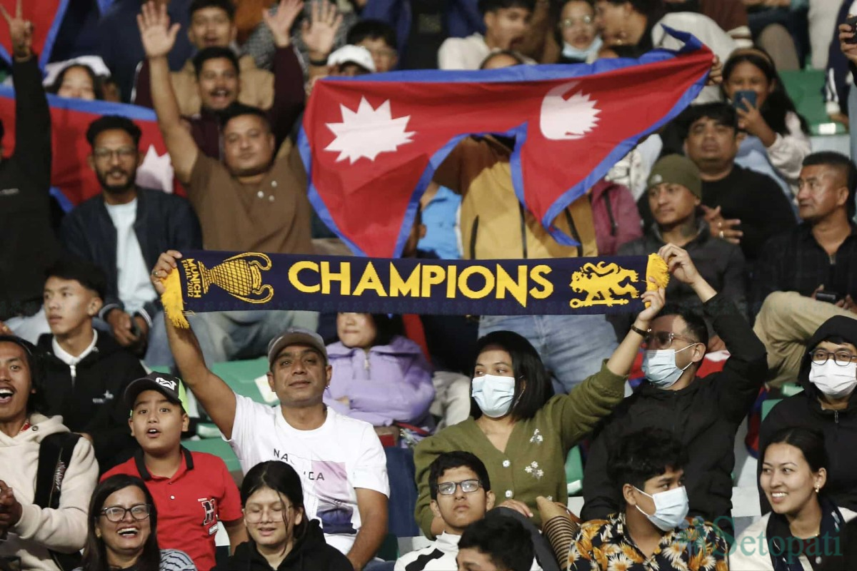 त्यस्तै दर्शकहरू पनि खेलाडीको हौसला बढाउन नेपालको झन्डा र जर्सी लगाएर रंगशाला पुगेका छन्।