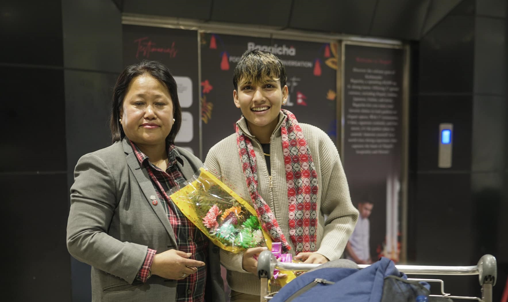 नेपाली राष्ट्रिय महिला फुटबल टोलीकी रेखा पौडेल शनिबार साँझ स्वदेश आइपुगेकी छिन्।