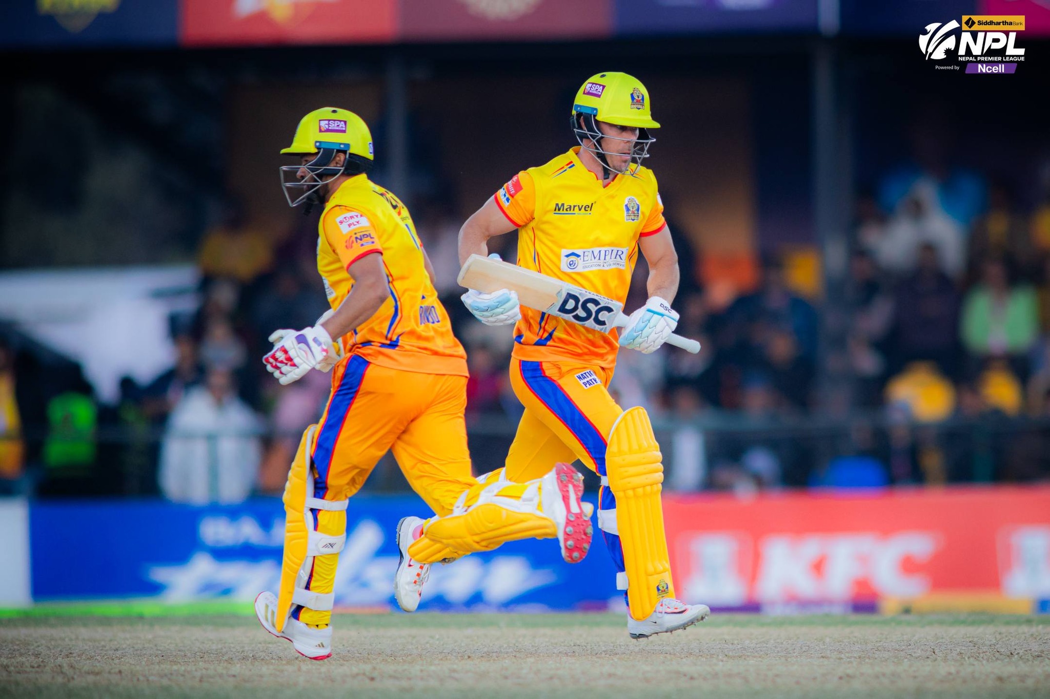 एनपिएल डेब्यू गरेका पुनित मेहराले १३ रन बनाए। मेहरा र पाण्डेलाई चितवनका सइफ जइबले क्याच गराउँदा डेब्यू इंग्लिस बलर जर्ज स्कृमशले हर्मितलाई आउट गरे। अन्त्यमा कप्तान दीपेन्द्रसिंह ऐरीले १४ बलमा नटआउट २४ रन र आरिफ शेखले १६ बलमा नटआउट २४ रन बनाए।