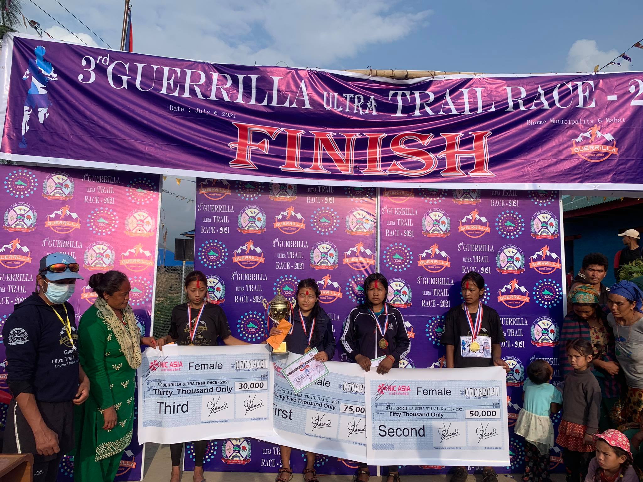 यस्तै महिलातर्फको उपाधि प्युठानकी हुमी बुढा मगरले जितिन्। हुमीले निर्धारित दुरी ८ घण्टा ३२ मिनेट ४७ सेकेण्डमा पुरा गरिन्। यस्तै ८ घण्टा ३७ मिनेट सेकेण्डमा ५२ किलोमिटर दुरी पार गरेकी भूमे गाउँपालिका–४, की रूजिना बुढा मगर दोस्रो हुँदा भूमे ३ दोमैकी निर्मला पुन तेस्रो भइन्। निर्मलाले ८ घण्टा ४० मिनेट ३८ सेकेण्डमा निर्धारित दुरी पार गरिन्। भूमे गाउँपालिका ६, कि शान्ति रोका मगर चौथो हुँदै सान्त्वना पुरस्कार जितिन्। महिलातर्फ २१ जनाले सहभागिता जनाएका थिए।