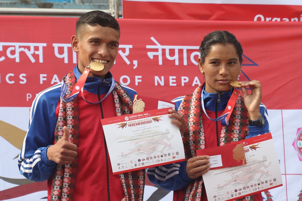 जुम्लाका प्रकाश कठायत र राममाया बुढाले युथ एथ्लिट च्याम्पियनशिपको यू–२० ३ हजार मिटर दौडमा पहिलो भएका छन्। पुरुषतर्फ प्रकाशले निर्धारित दूरी ९ मिनेट २२.५ सेकेन्डमा पुरा गदै पहिलो भए । कपिलबस्तुका अजय पाण्डे दोश्रो र ललितपुरका महेश सिजाली तेश्रो भए । यू–२० ३ हजार मिटर महिला दौडमा जुम्लाकी राममायाले निर्धारित दूरी १० मिनेट ४४.५ सेकेन्ट पुरा गदै स्वर्ण जितिन् । जुम्लाकै वमजना बुढाले रजत र सुर्खेतकी विमला कार्की कास्य जितिन् ।