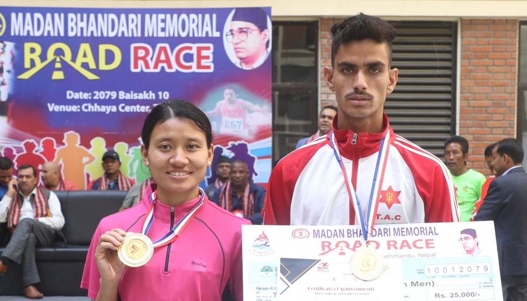 मुकेशबहादुर पाल र सन्तोषी श्रेष्ठ तेश्रो मदन भण्डारी स्मृति ५ किमि रोड रेसको खुलातर्फ शनिबार पहिलो भएका छन्।