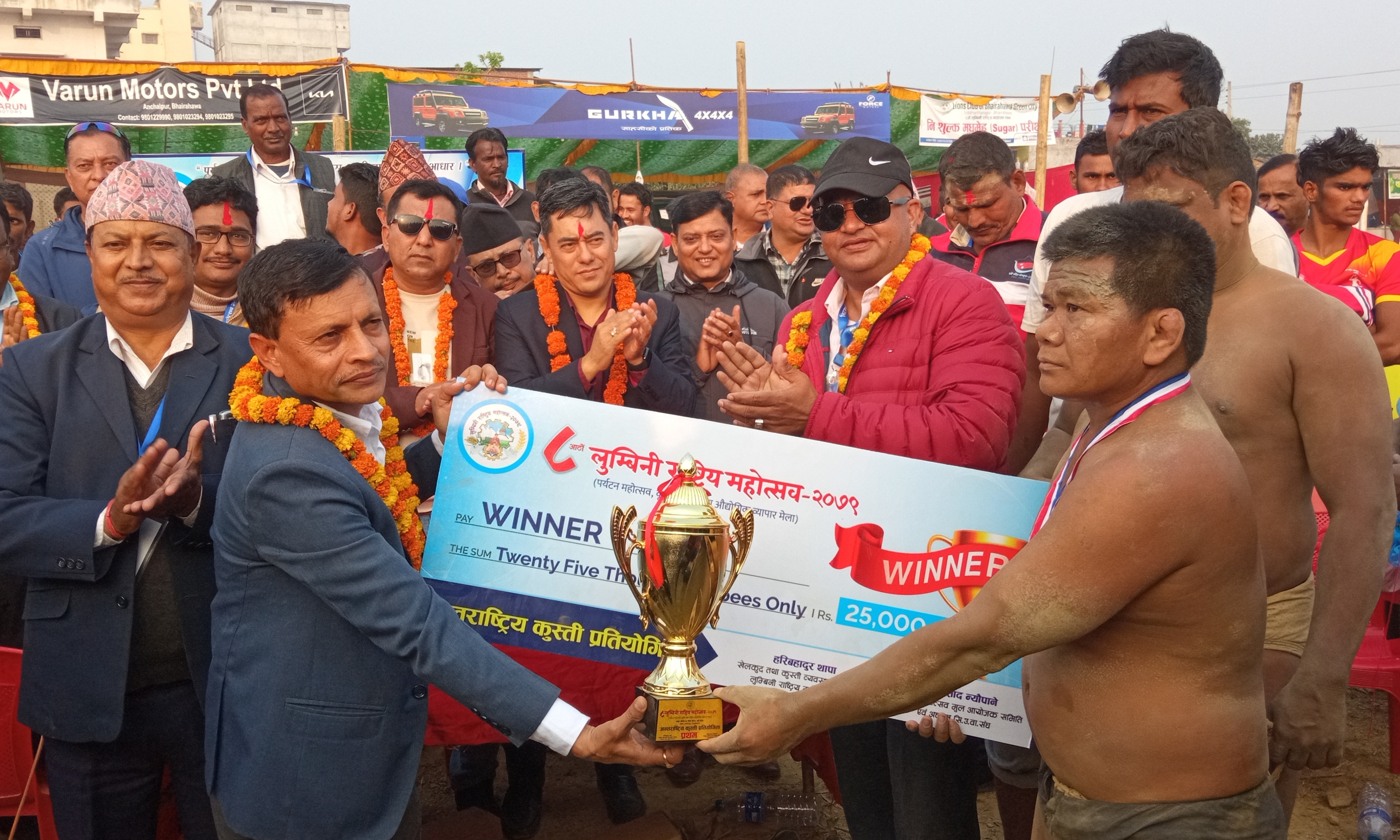 विजेता खेलाडीहरूलाई पुरस्कार तथा ट्रफी प्रदान गर्दै महोत्सव आयोजक संस्था एव सिद्धार्थ उद्योग वाणिज्य संघका अध्यक्ष भीष्मप्रसाद न्यौपानेले लोप हुँदै गइरहेको कुस्ती खेलको जगेर्नाको लागि महोत्सवमा प्रतियोगिता आयोजना गरिएको बताए।
