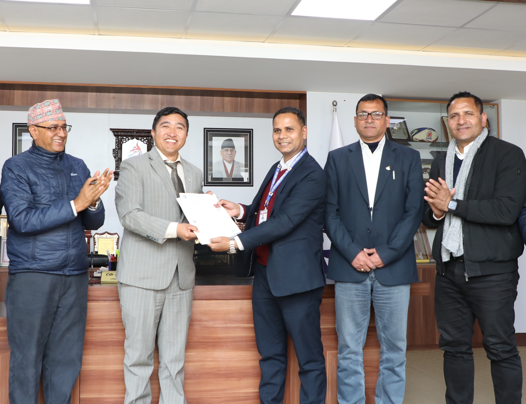 राखेपका सदस्य–सचिव टंकलाल घिसिङलाई राष्ट्रिय बिमा कम्पनी लिमिटेडका मार्केटिङ म्यानेजर देवराज घिमिरेले बिमा लेख हस्तान्तरण गरे ।