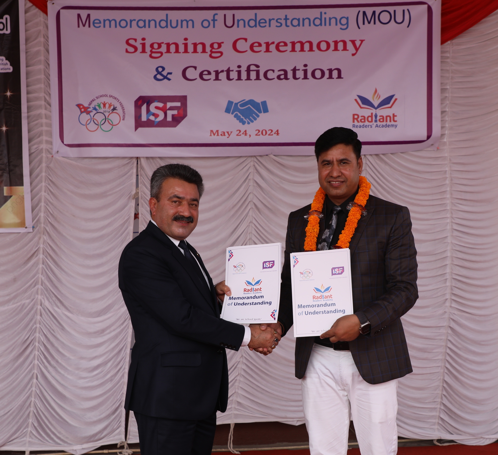 रेडियन्टका संस्थापक प्रिन्सिपल डिके ढुंगाना र एनएसएसएफका महासचिव समेत रहेका अन्तर्राष्ट्रिय विद्यालय खेलकुद महासंघ (आईएसएफ) का कार्यकारी सदस्य राजकुमार कार्कीले सम्झौता पत्रमा हस्ताक्षर गरे । सम्झौतासंगै रेडिअन्टले आईएसएफको स्वीकृतिमा एनएसएसएफको आधिकारिक सदस्यताको मान्यता पाएको छ ।