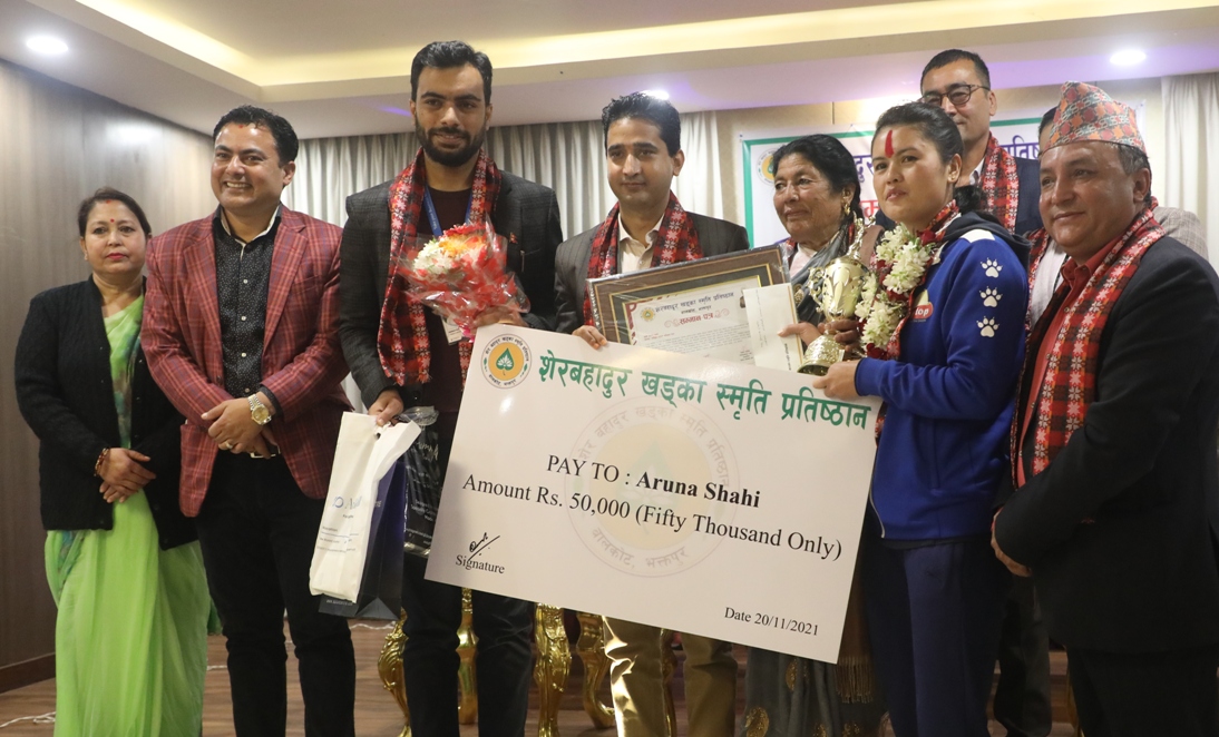 शेरबहादुर खड्का स्मृति प्रतिष्ठानले नेपाली राष्ट्रिय महिला भलिबल टोलीकी कप्तान अरुणा शाहीलाई शेरबहादुर खड्का स्पेसल अवार्ड– २०७७ बाट शनिबार सम्मान गरेको छ।